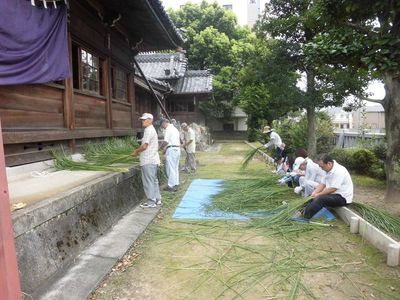 | このチガヤの準備も大変な作業でかなりの人数で行っています。 | 芝馬の製作前にまずは参拝です。いよいよ製作も開始されます。 | 顔の部分の「より」から開始していきます。神経を使います。 | よりを三枚作り顔になる部分が午前中に出来上がります。 |