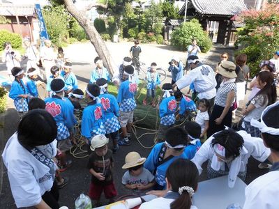 氏子たちは道路いっぱいに元気に声を上げて練り歩きます。 | 途中休憩までもう少し・・・。みんな本当に元気よく声を出してくれました。 | 正高寺の境内にて休息を取ります。飲み物もおかわりしてました。 |